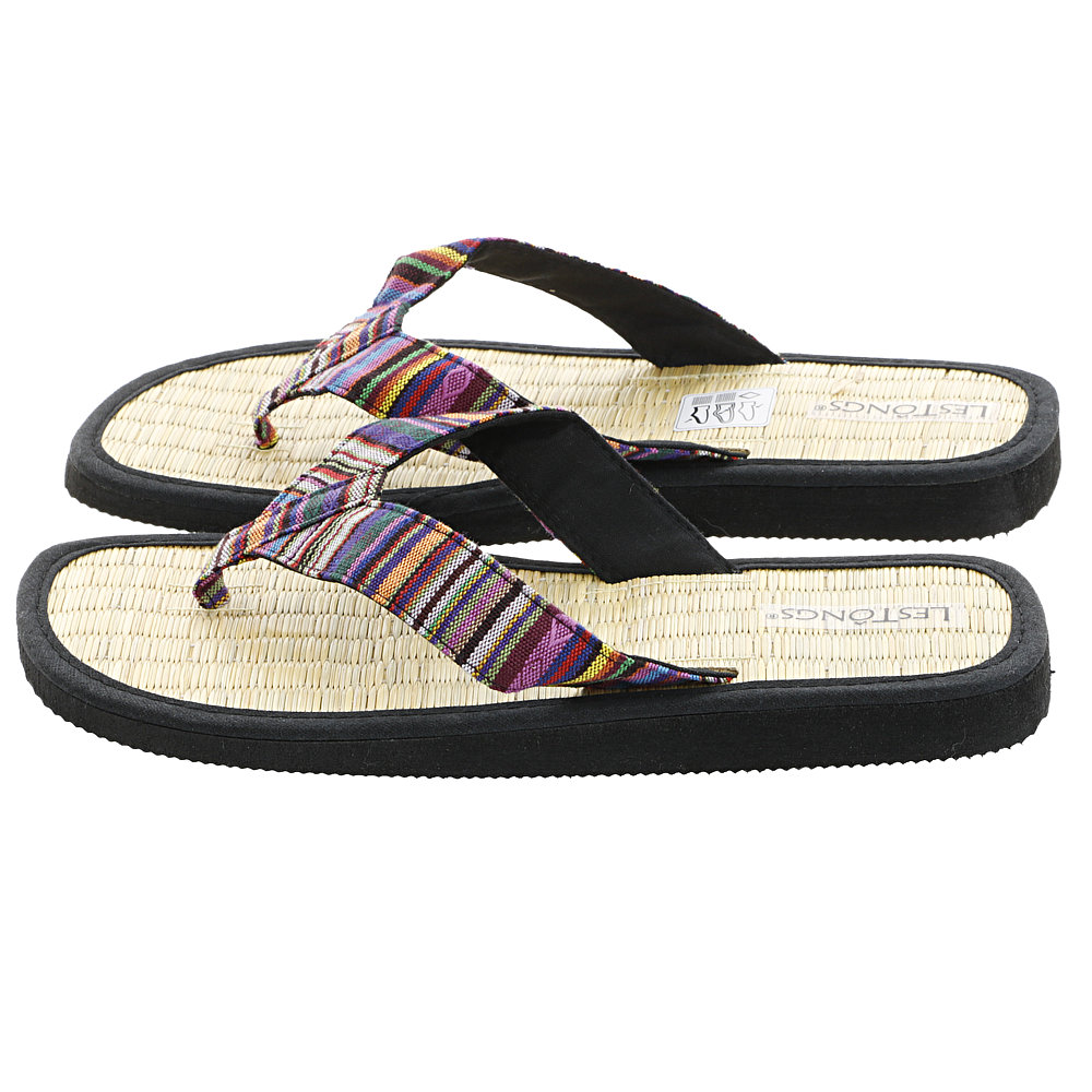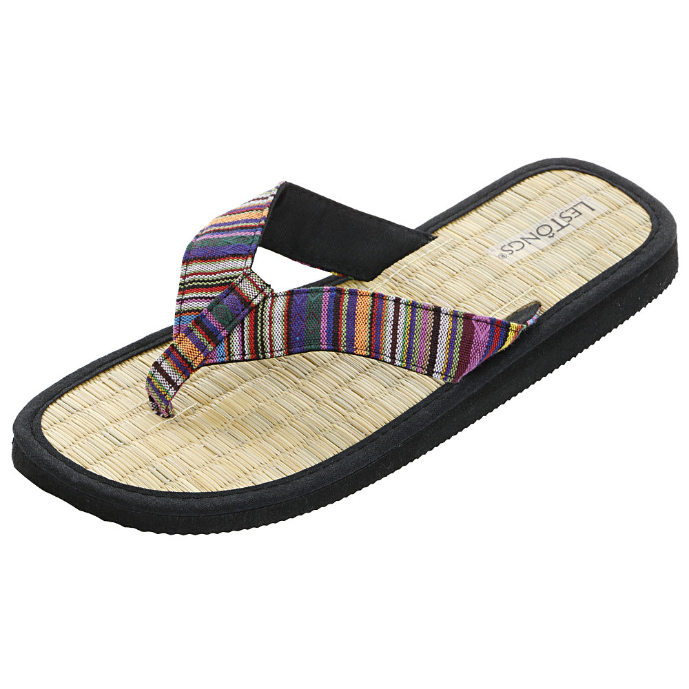Der modische Träger mit Zehensteg besteht aus Baumwolle. Das bunte Design mit allen möglichen Farben des Regenbogens ist vor allem für Frauen gedacht.