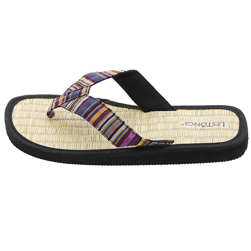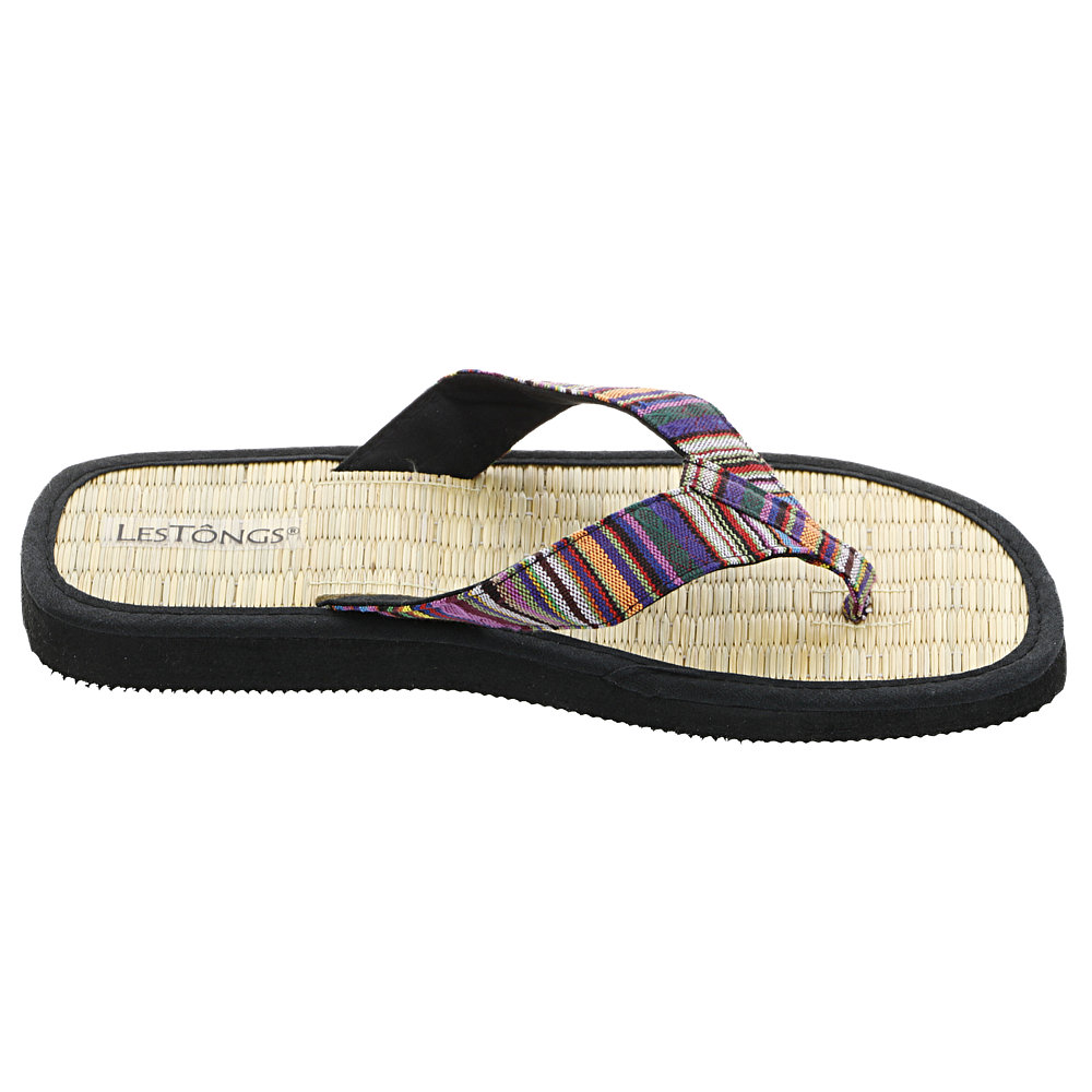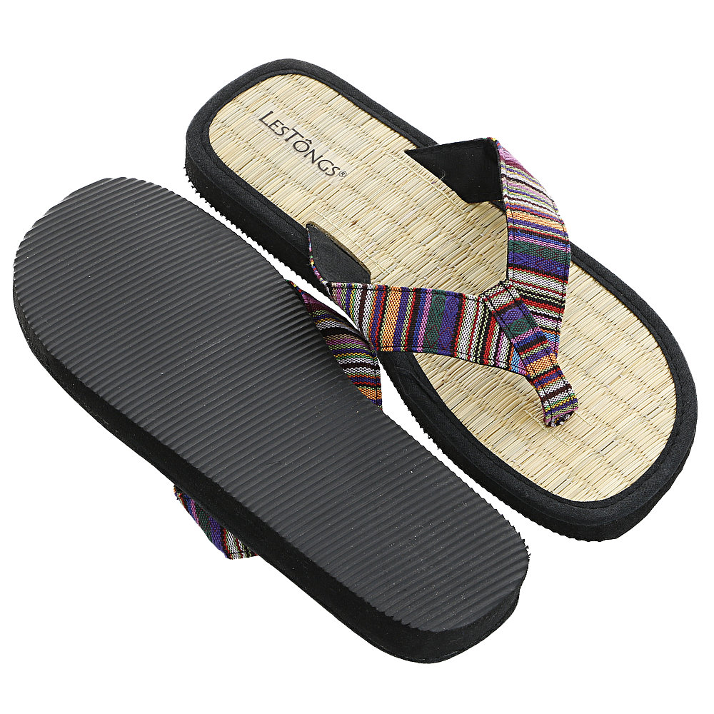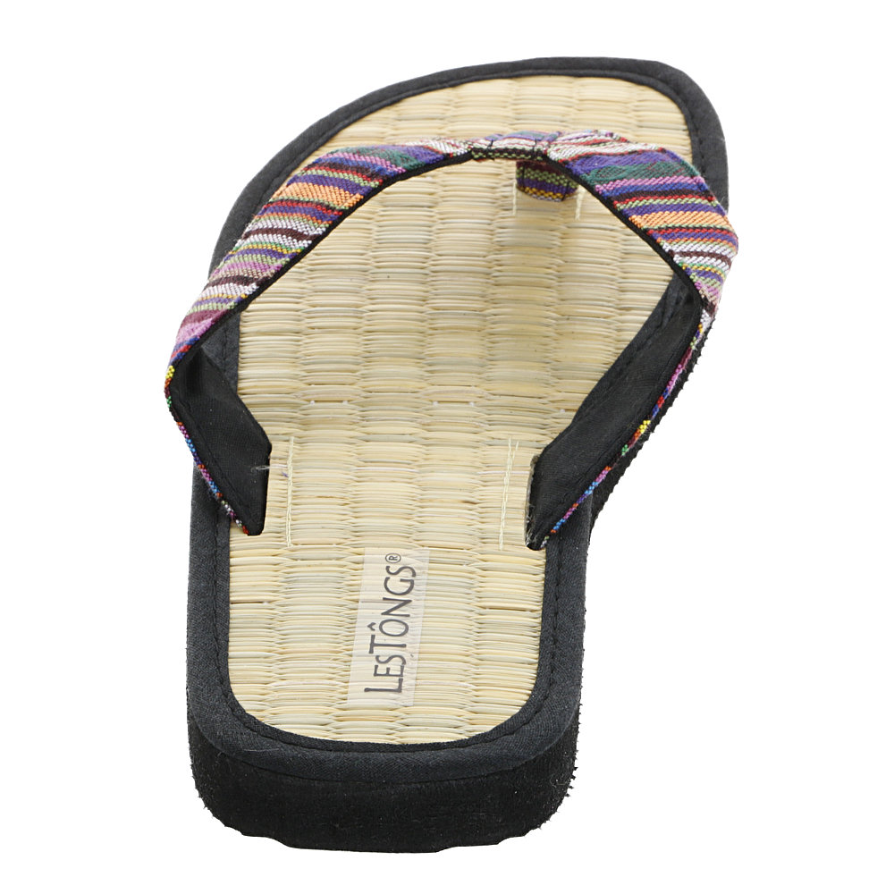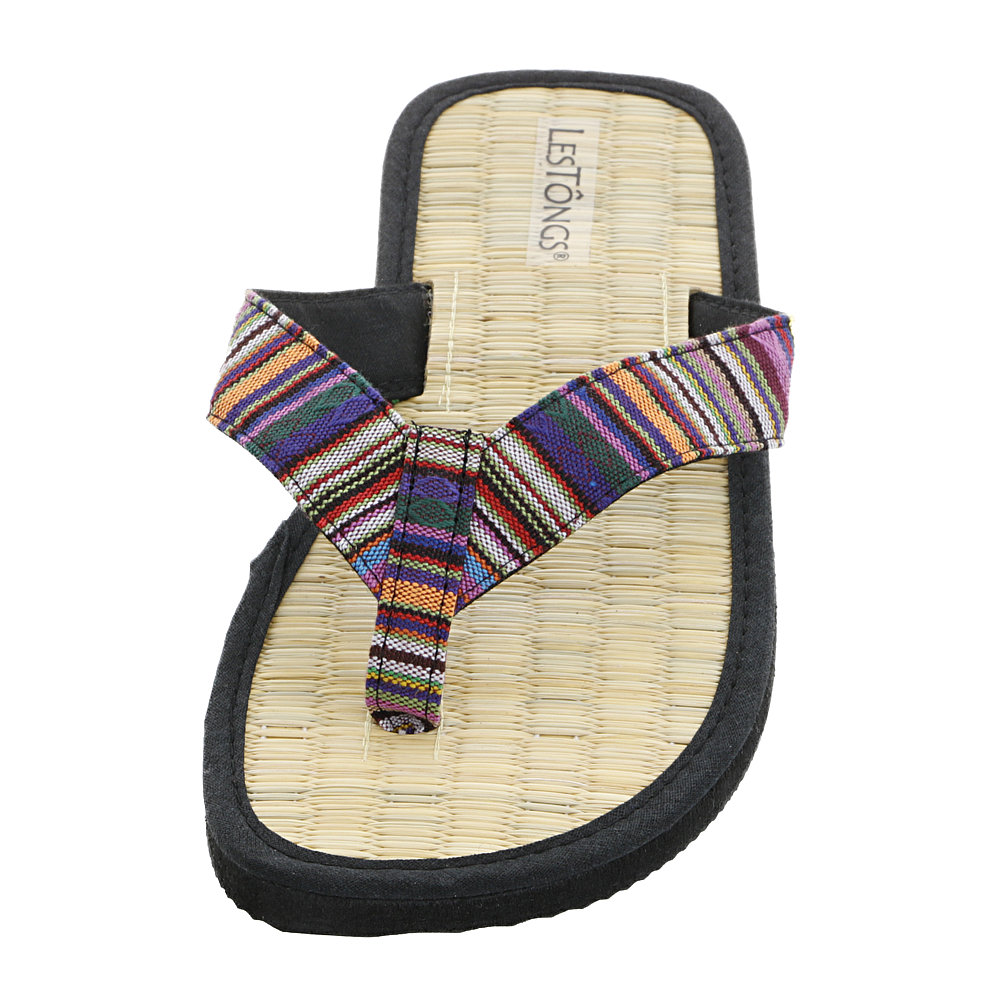 Die Zimtlatschen Les Tôngs Karafuru sind als Schuhe mit Zimtsohle für Damen entwickelt worden. Die bunt gestreiften Flip Flops sind leichte Sommerschuhe mit einem Trageriemen aus Baumwolle. Die Zimtlatschen haben eine offene Form und profitieren von den Eigenschaften des Zimts.