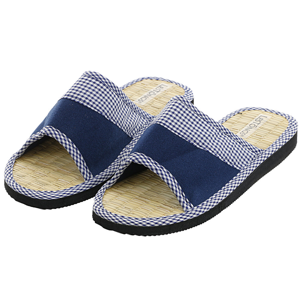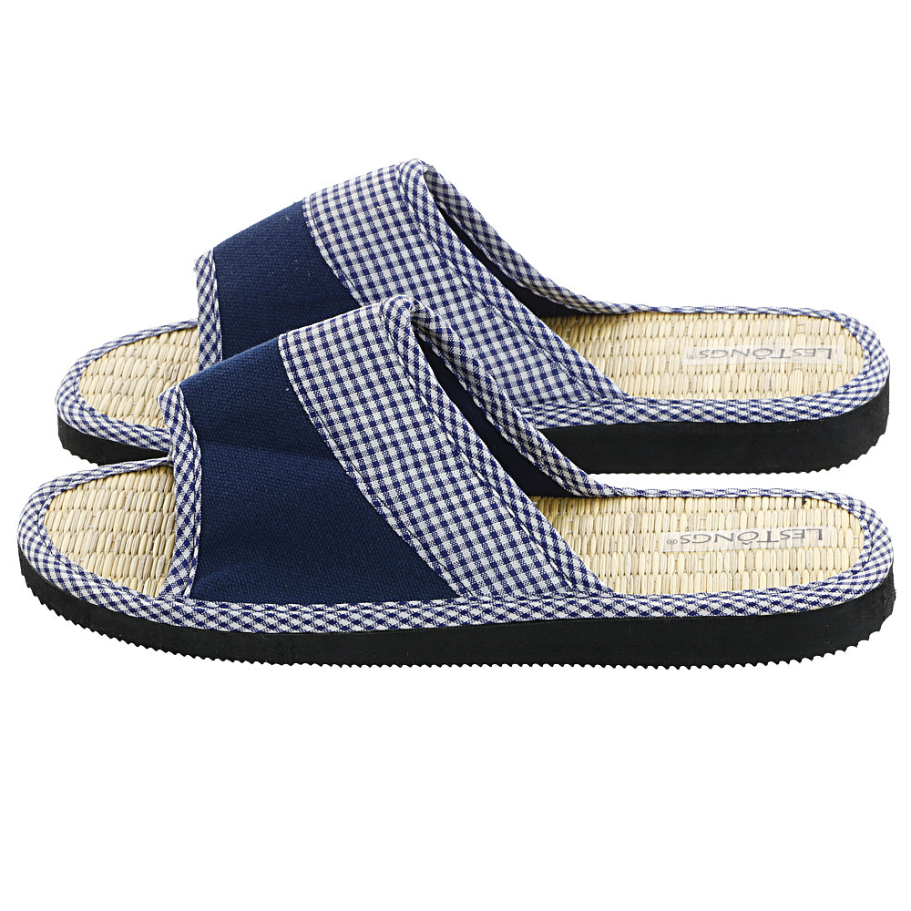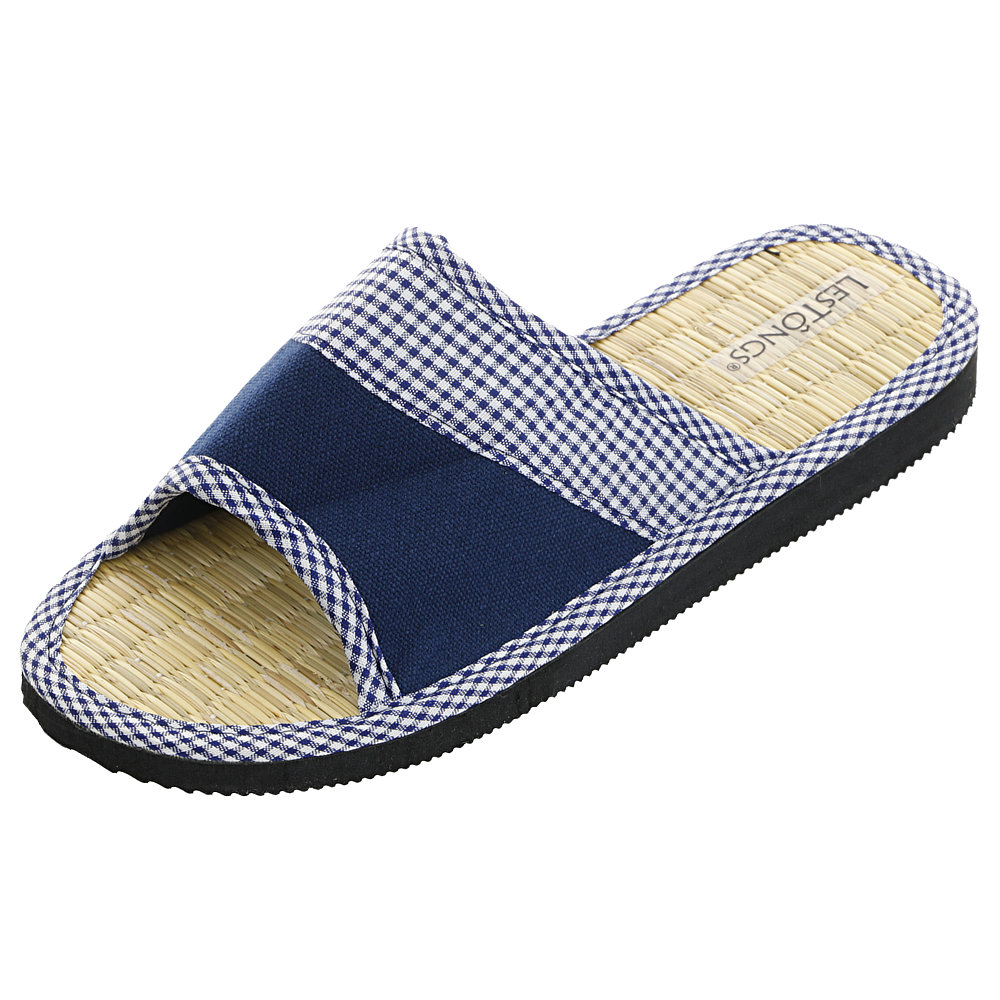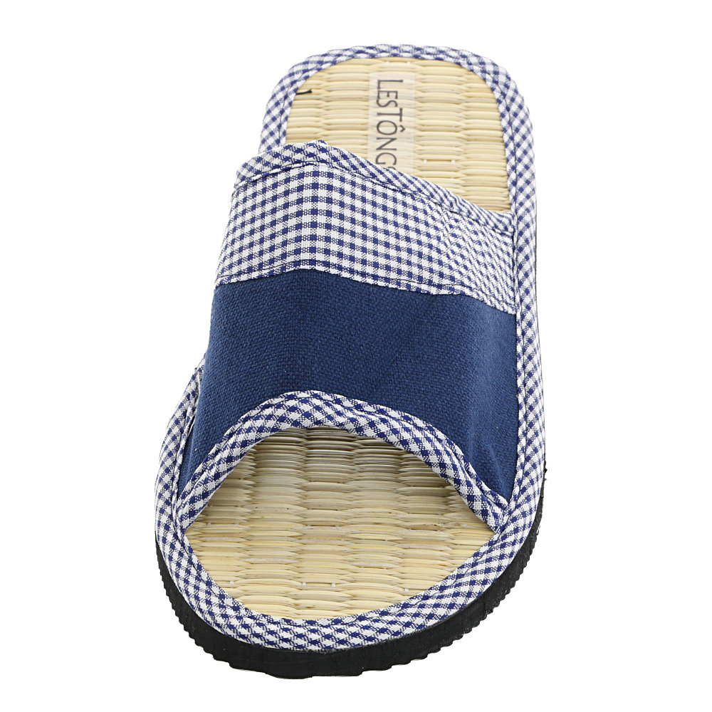 Das Fußbett aus Binsen wurde mit einem weiß-blauen Baumwollband umfasst. Die Laufsohle besteht aus Gummi (EVA).