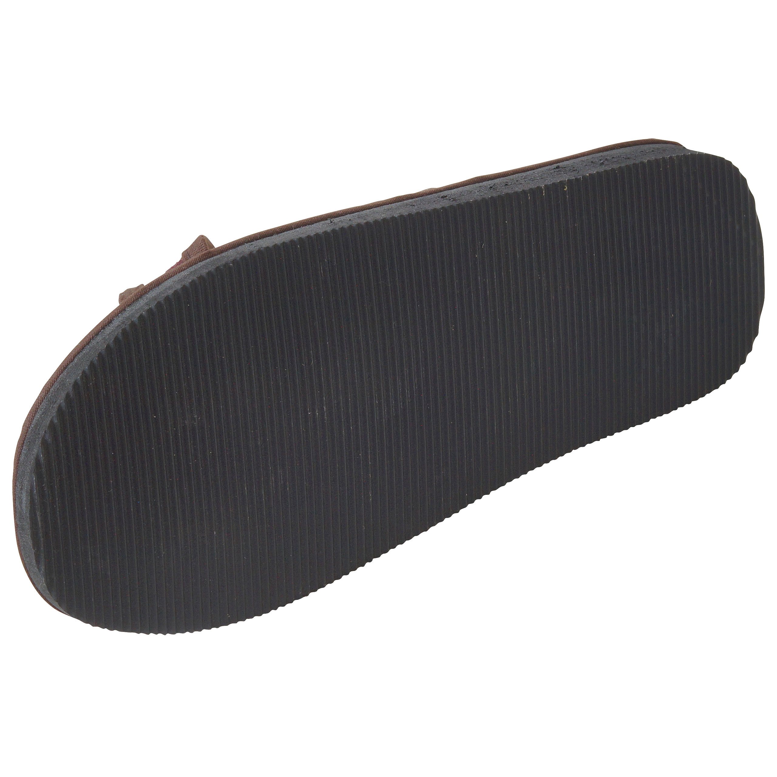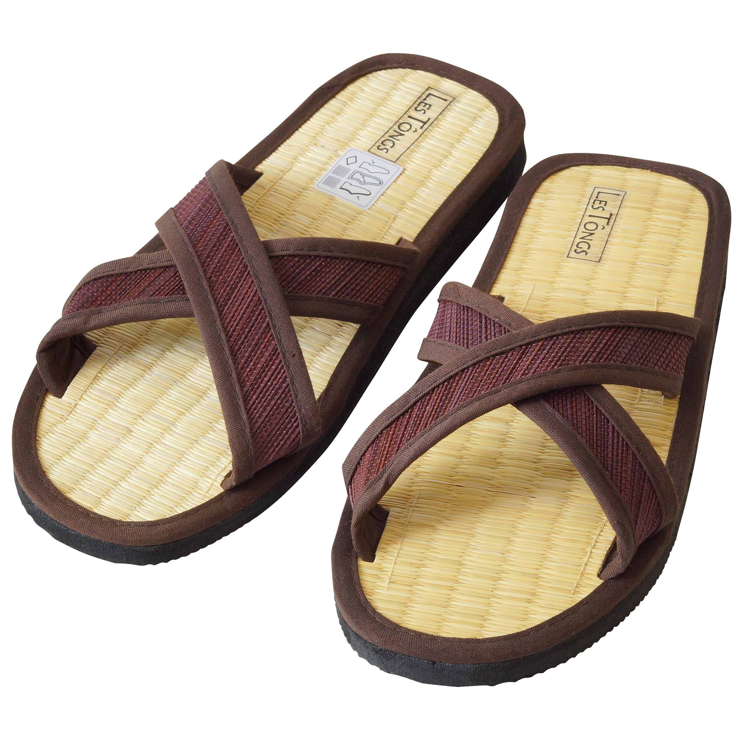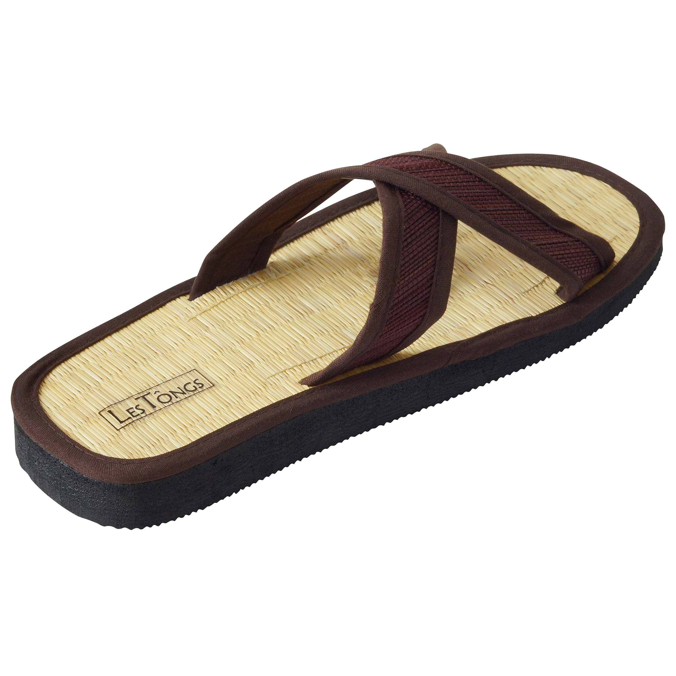 - Das Obermaterial besteht aus dunkelbraunen Binsen, die mit einem schmalen Baumwollband eingefasst sind.